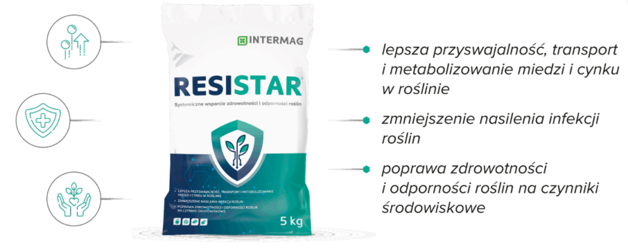 Miedź można dostarczyć w postaci nawozu AMINO ULTRA® Cu-24 lub nowego produktu z oferty firmy INTERMAG – RESISTAR®. Preparat ten jest aktywatorem odporności i zdrowotności roślin. Zawiera miedź i cynk w formie chelatów organicznych (glicynianów) oraz krzem w biodostępnej formule Si-duoSIL.