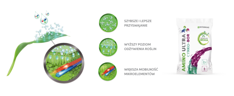 Glicyna jest najmniejszym i najbardziej mobilnym aminokwasem w roślinach. Dzięki temu mikroelementy z nią połączone są szybciej i efektywniej transportowane w roślinie niż w przypadku prostych soli, tlenków czy innych substancji kompleksujących. Taka formulacja zapewnia skuteczne i bezpieczne odżywianie nawet w trudnych warunkach uprawy. W ofercie firmy Intermag znajduje się cała grupa nawozów AMINO ULTRA® opartych na technologii GCAA.