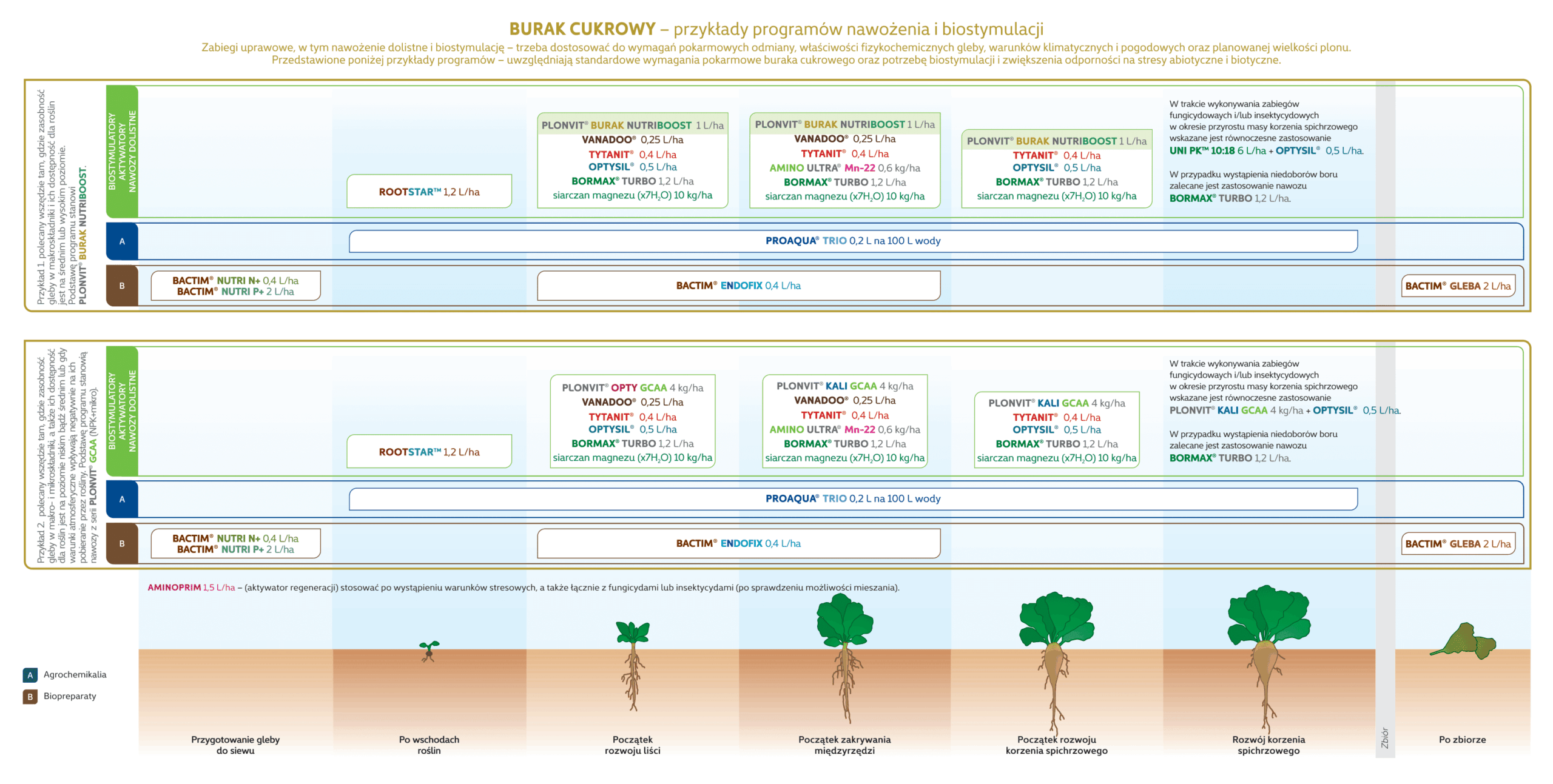 Natomiast całość zapotrzebowania buraków na mikroelementy można zrealizować nawożeniem dolistnym. Wśród mikroelementów dla buraka najważniejsze są: bor (BORMAX® TURBO), mangan (AMINO ULTRA® Mn-22 lub MIKROCHELAT™ Mn-13 lub MIKROVIT® MANGAN), miedź (AMINO ULTRA® Cu-24 lub MIKROCHELAT™ Cu-15 lub MIKROVIT® MIEDŹ) i cynk (AMINO ULTRA® Zn-24 lub MIKROCHELAT™ Zn-15 lub MIKROVIT® CYNK), a także molibden (MIKROVIT® MOLIBDEN).